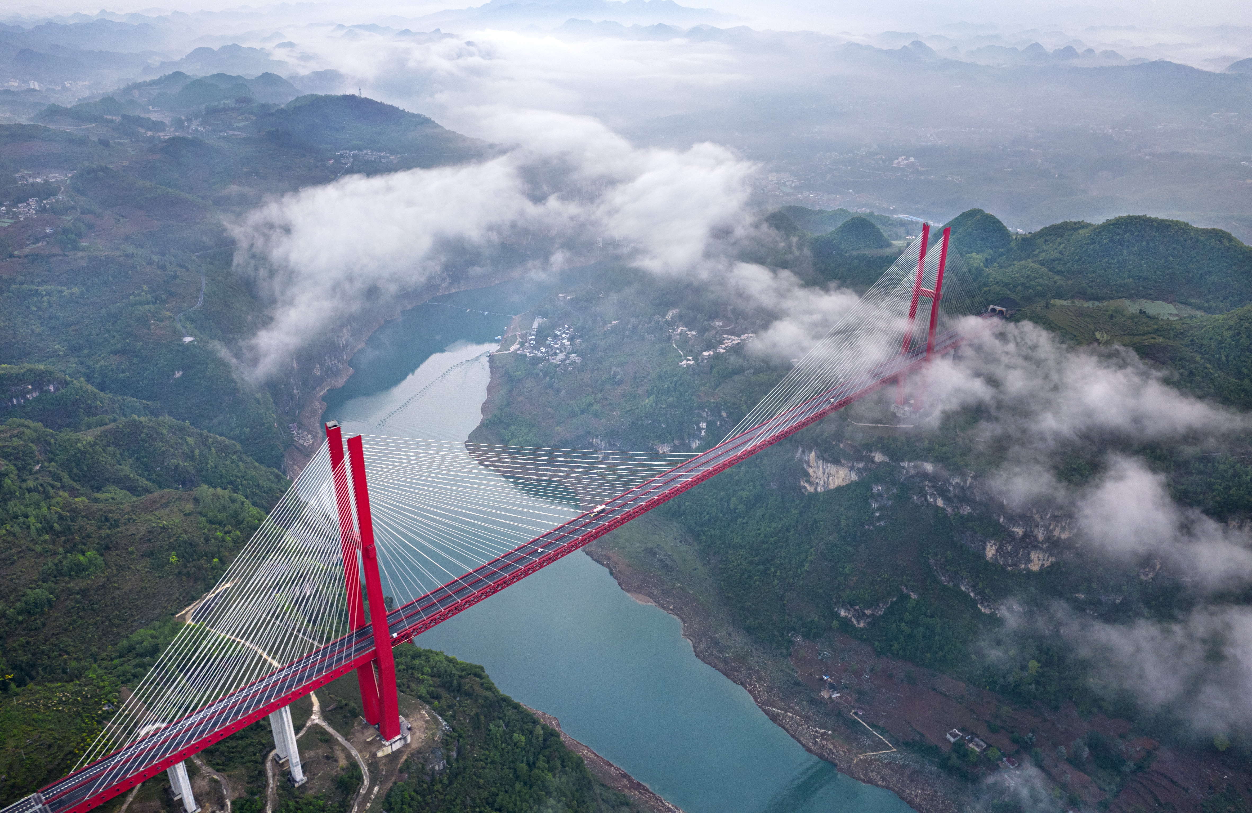 红色的大桥如彩虹飞过云端,飞驰的汽车穿过云雾驶向远方。